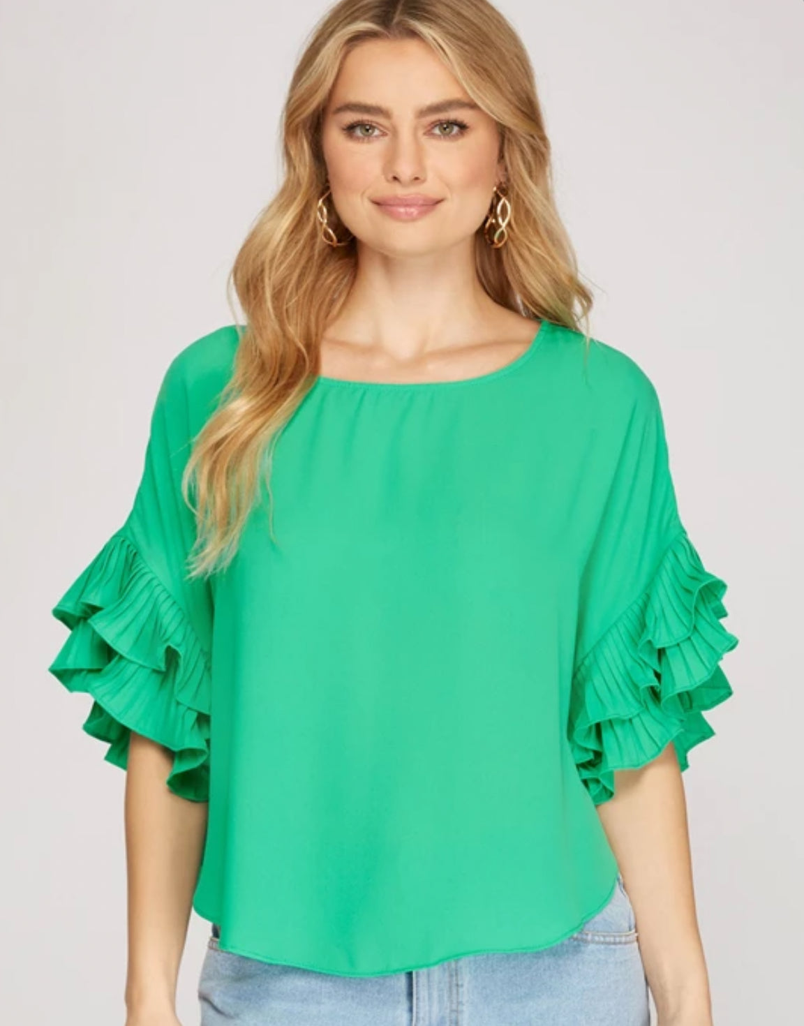 Green Blouse with Ruffle sleeves. Higher sides and lower front and back.