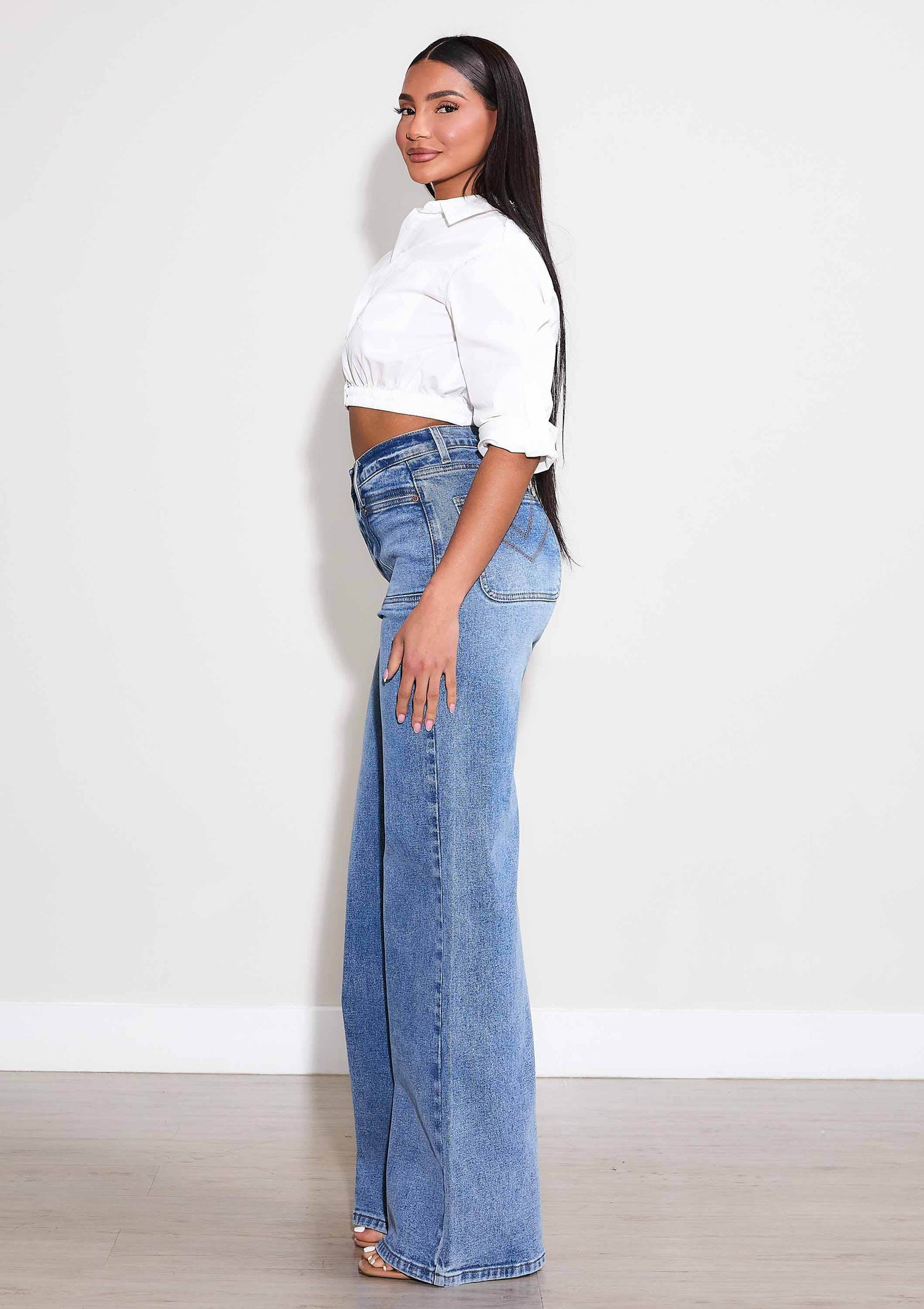 A pair of wide leg jeans featuring front square pockets, back pockets and a zip-fly closure.